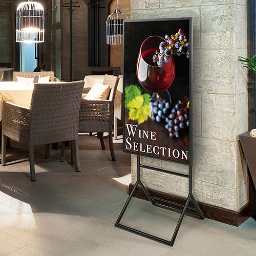 移動に便利なローラーキャスター付き、垂直タイプの簡易サイネージスタンド。
